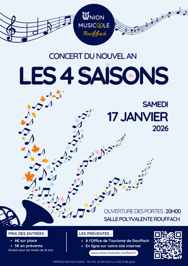 L'Union Musicale de Rouffach est de retour en 2026 pour son concert de Nouvel An! Les musiciens sous la direction de Marina GROSS vous donnent rendez-vous le 17 janvier! Un concert-spectacle original, mêlant récit et musiques des quatre saisons, pour revisiter en musique un thème qui nous concerne tous.
